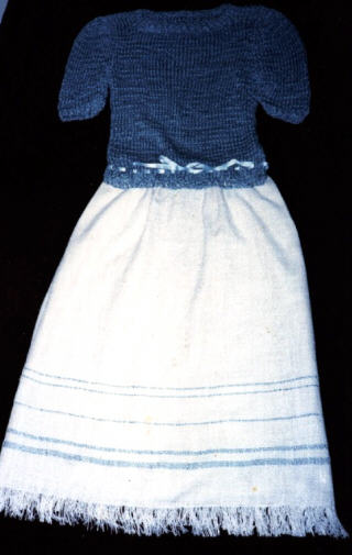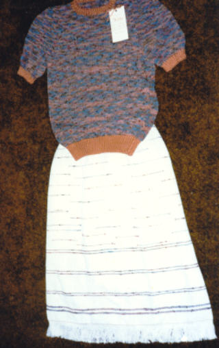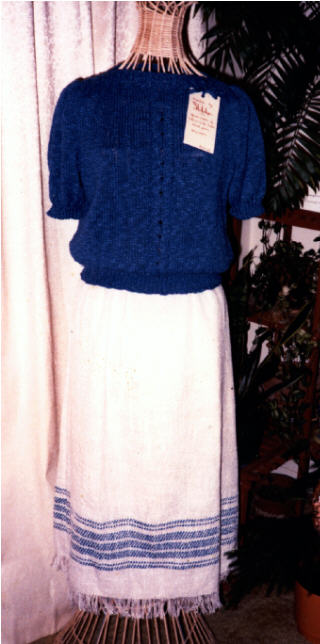 The skirts pictured below are three of 70 skirts I wove for Sally DeLisle, who made custom knitted sweaters and then sent me the sweater yarn, and/or ribbon which I used to detail the woven skirt. The skirts were cotton and the sweaters used a variety of fibers. The yardage was shipped to a seamstress to be made up as fully lined skirts, each one unique. Sally sold the pieces as a set at home fashion shows.