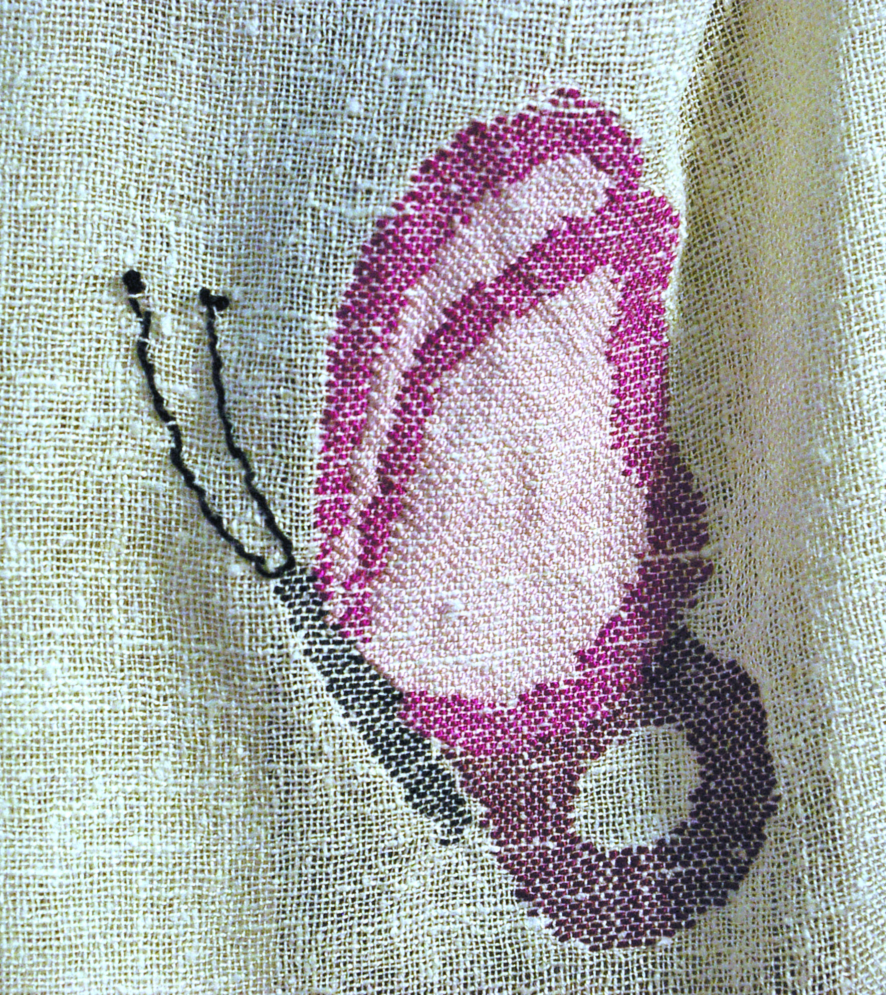 I took the same butterflies and inlaid them on a fine silk noil yarn for scarves. They have a lightness and sheerness that adds to the ethereal feeling of butterflies in flight. The pink scarf is a cotton inlay, and the blue one has a beautiful shiny rayon yarn.