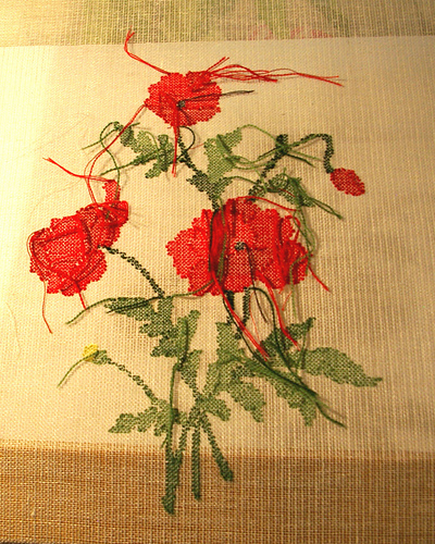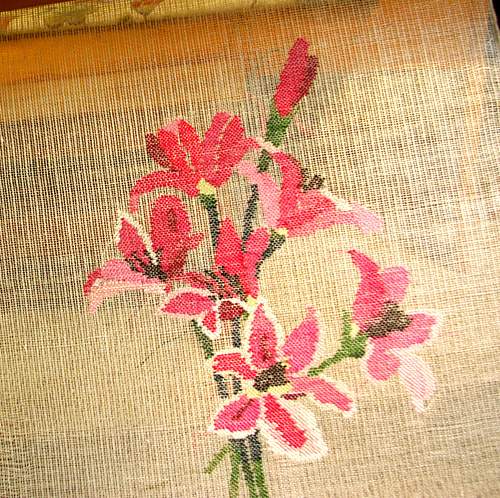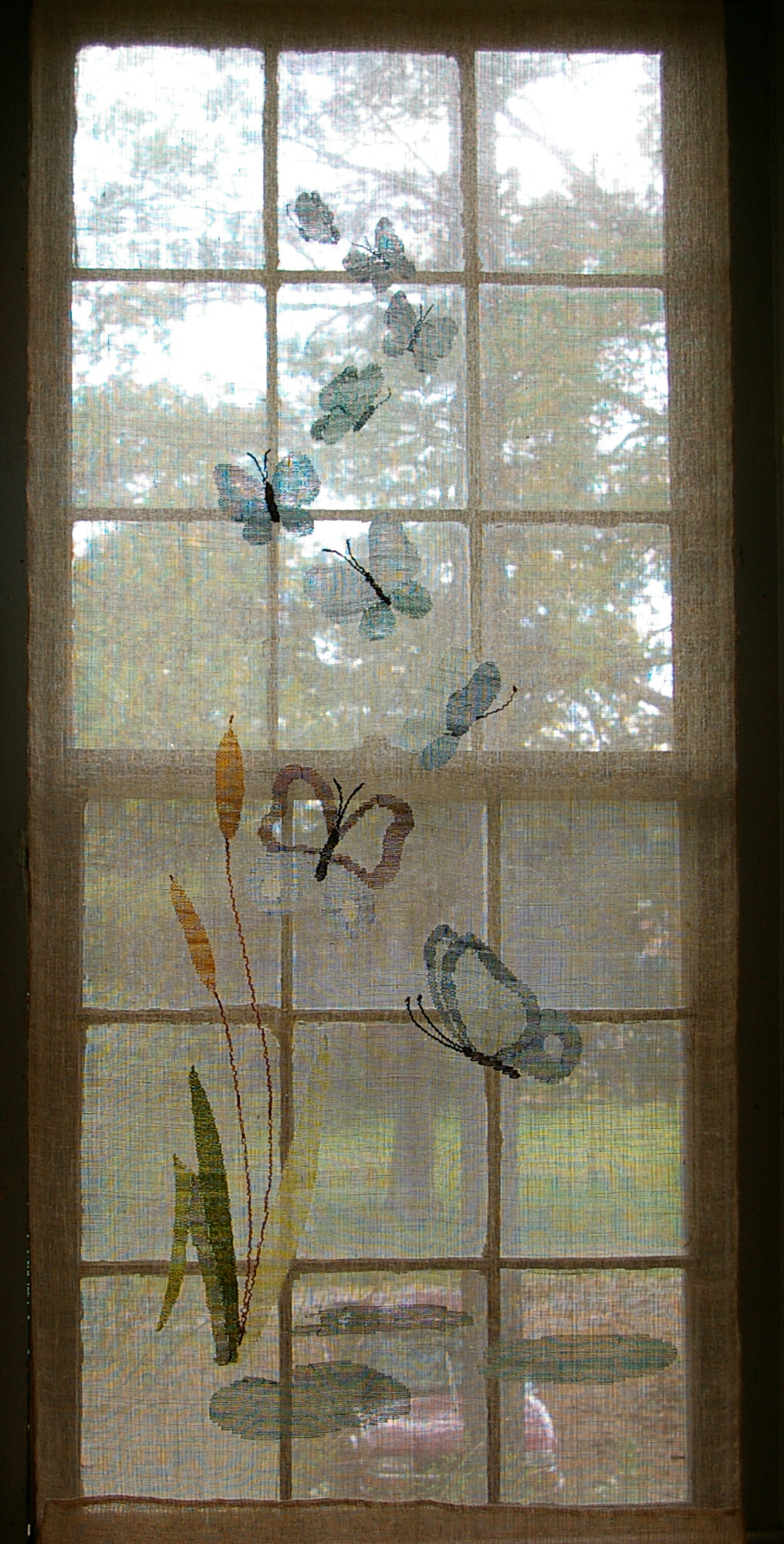 These photos show the weaving still on the loom. Once finished, they will be hemmed and framed, and can be hung with the light coming through the linen. As the daylight changes, so will the colors and vibrancy of the flowers-at times they will be bright and colorful, and at times shadows and shapes on a sheer background.