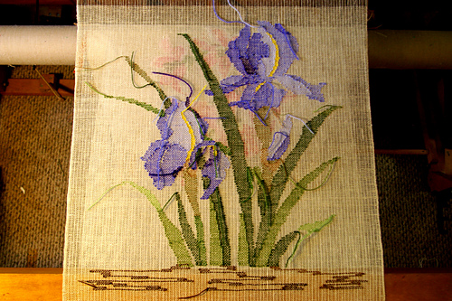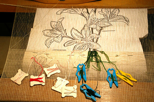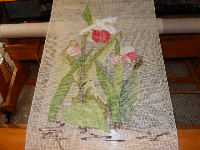 The linen warp is a fine singles linen sett at 15 epi., and the flower inlays are tapestry wools. Each line of the inlay is added as the background fabric of linen is woven selvedge to selvedge with a shuttle. The first pictures show the lilies in progress, with all the bobbins of inlay wool, and the diagram underneath, showing through the sheer linen. The cartoon, or drawing, is pinned underneath, and moved as the weaving advances.